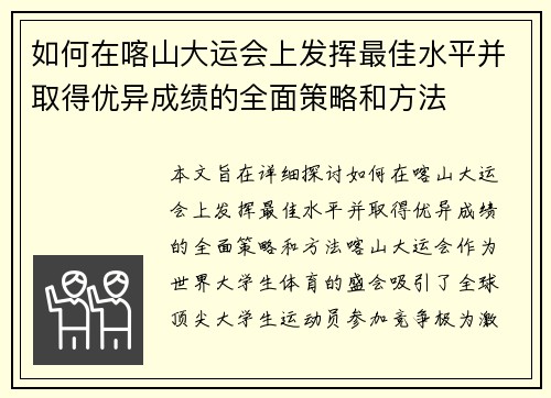 如何在喀山大运会上发挥最佳水平并取得优异成绩的全面策略和方法